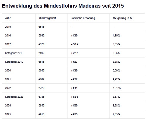 Madeira hat bisher den höchsten Mindestlohn unter den Regionen Portugals beibehalten, da die Menschen dort im Allgemeinen höhere Ausgaben haben als auf dem Festland. Lebensmittel und Unterkunft sind dort generell teurer. Die nächste Überprüfung des regionalen Mindestlohns wird für Anfang 2026 erwartet, in Abstimmung mit nationalen Entscheidungen.